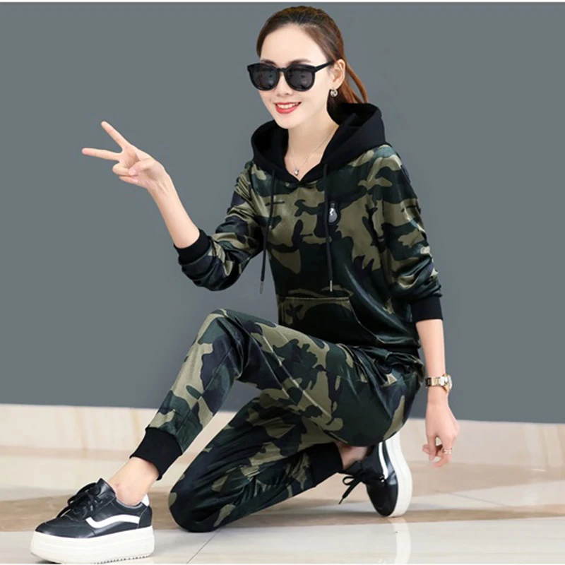 BEST 2020 new spring camouflage Hooded suit female large size fashion long-sleeved gold velvet sportswea
