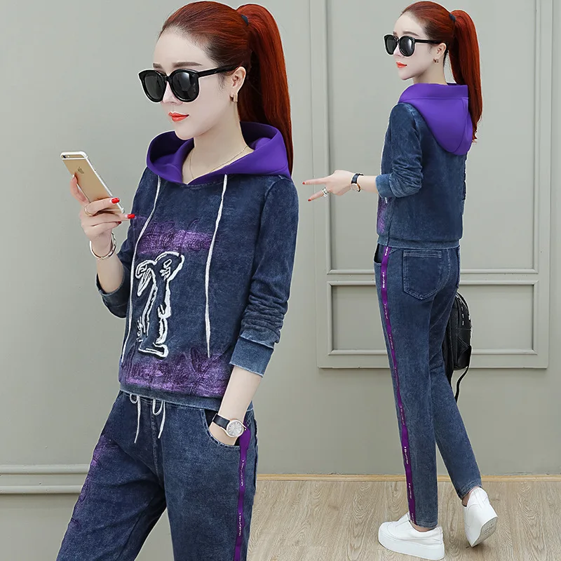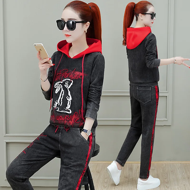 Hot Sale Korean Style Clothing Set Autumn Women Denim Two Piece Set Tracksuit Jeans Tops + Pants Suit Female